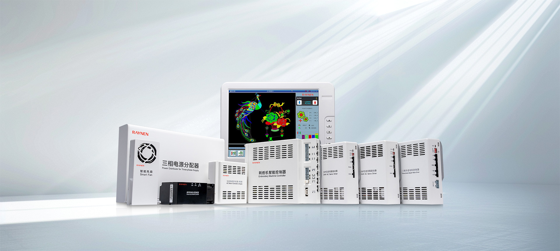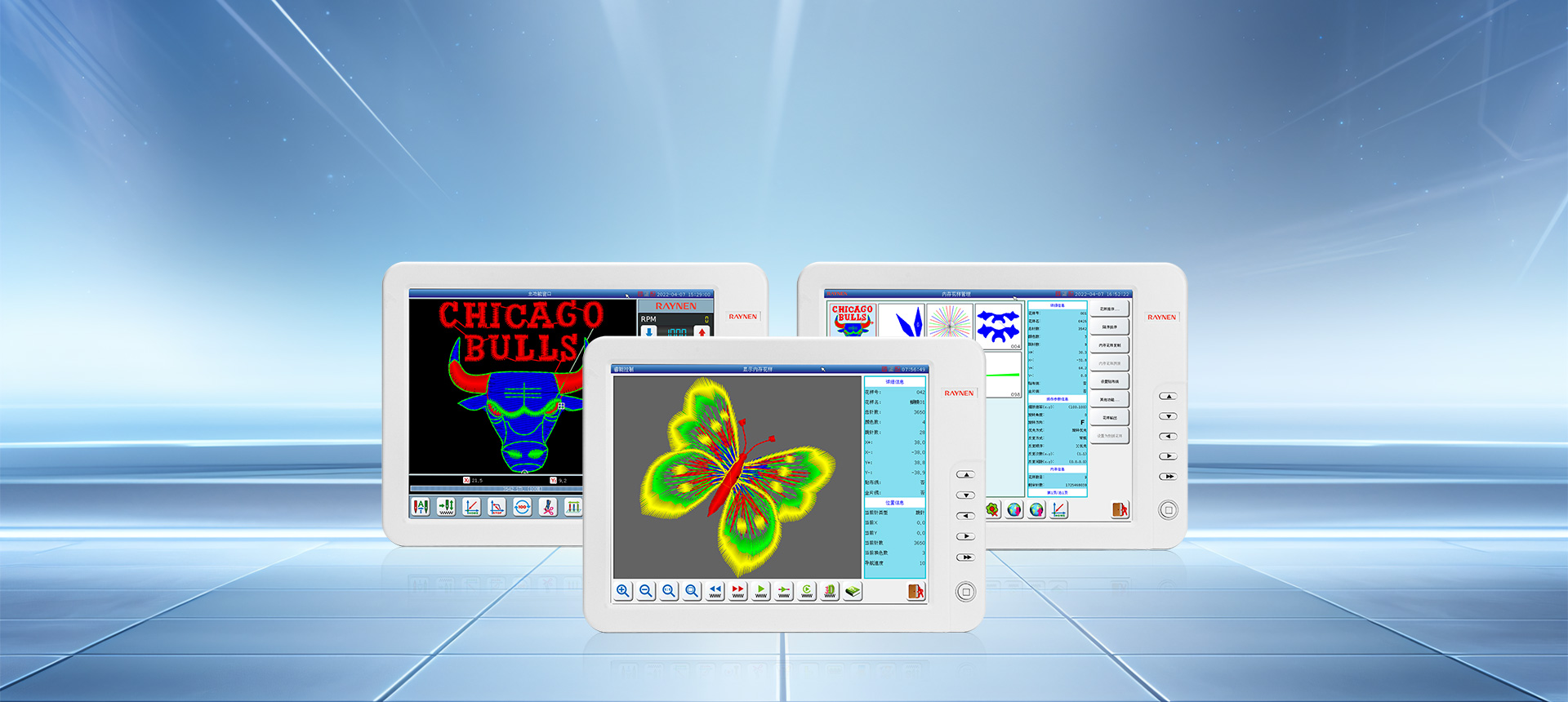 RN系列可組態(tài)平繡電腦刺繡機電控就是利用多個高端嵌入式單片計算機來搭成一個較為復(fù)雜的多軸服裝數(shù)控加工控制系統(tǒng)。通過網(wǎng)絡(luò)或USB方式,接受來自PC計算機CAD所生成的五彩繽紛花樣文件,通過X、Y平面框架、主軸Z及換色T的多軸綜合控制的數(shù)字控制系統(tǒng)來完成各種各樣花版的圖形繡作。在服裝皮革鞋帽等面料上產(chǎn)生出花樣絢麗、立體感強、邊角清晰的繡品。同時支持日新月異的特種繡功能,包括支持繩繡、盤帶繡、多金片繡、多疊片、散珠繡、毛巾繡、激光、熱切割、燙鉆、泡珠、雕孔繡等多種特種繡功能。