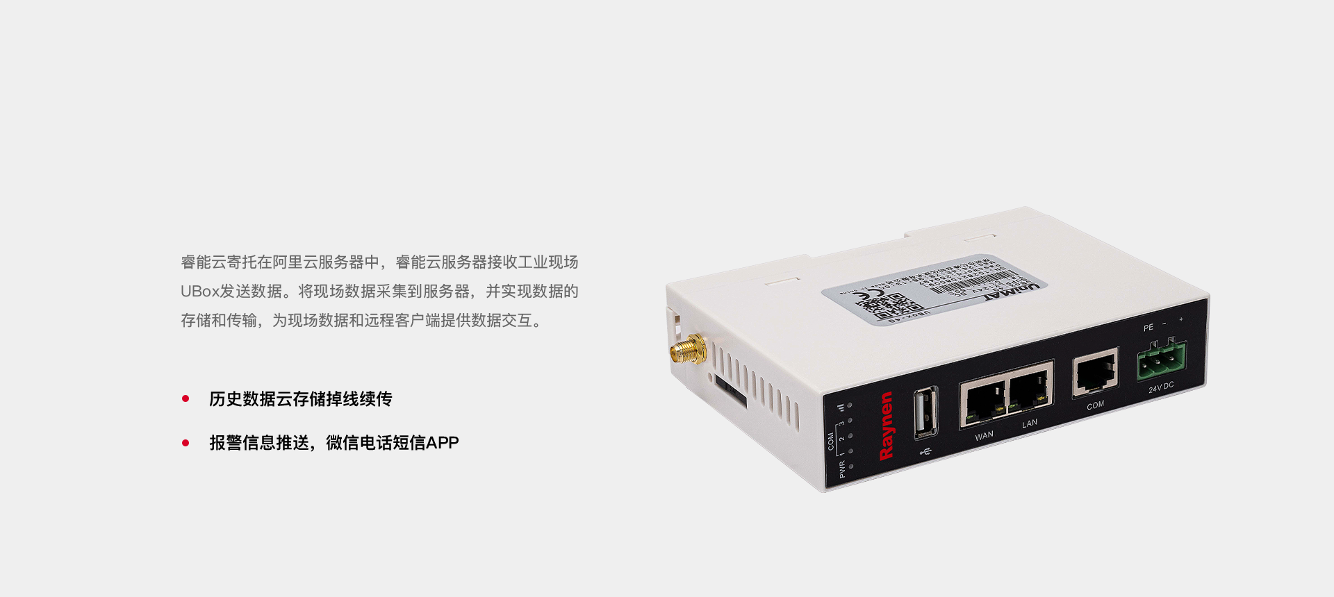 UBOX系列物聯(lián)網(wǎng)關(guān)是睿能工業(yè)物聯(lián)網(wǎng)整體解決方案中的數(shù)據(jù)采集終端產(chǎn)品,用于連接PLC、變頻器和儀表等設(shè)備,通過(guò)WAN、WIFI、4G實(shí)現(xiàn)聯(lián)網(wǎng),將設(shè)備數(shù)據(jù)傳送到睿能云平臺(tái)。